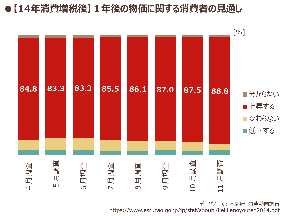 さらに、内閣府の消費動向調査でも、1年後に物価が上昇すると予想する人が増加傾向にありました(図表13)。増税に加えて物価上昇の懸念も相まって、負担感と先行きへの不安が広がっていったようです。