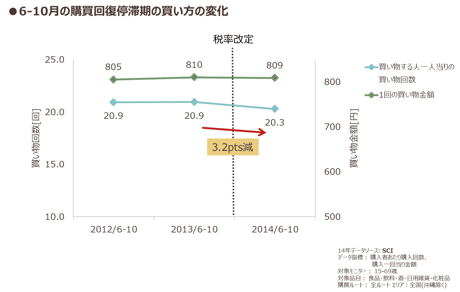 増税から半年経っても、生活者の半数が「生活のゆとりが少なくなった」と感じていたり、時間が経つにつれて中長期的な不安を感じる人が増えたりするなど、生活者心理の変化を背景に、買い物の回数が減り、購買の回復が停滞していたようです。