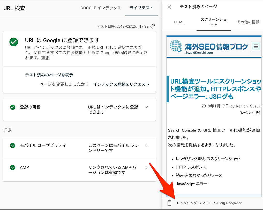 ※モバイルファーストインデックスに移行していないサイトは両方のスクリーンショットを取得可能だ。通常はPCページのレンダリングになるが、モバイルユーザビリティレポートからURL検査ツールを実行するとモバイルページをレンダリングできる。