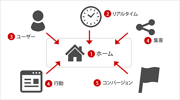 複雑そうに見えるGoogle アナリティクスですが、基本の画面構成は以下のようになっています。まずは、この6つの画面で成り立っていることをおさえておきましょう。