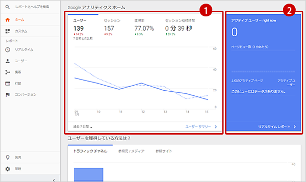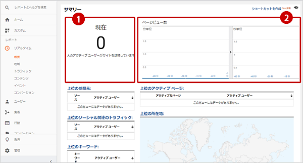 もし、自ら自社のホームページにアクセスしている状態なのに、「現在のアクティブユーザー数」が「0」だった場合は、Google アナリティクスの設置がうまくできていないかもしれません。前回のコラムを参考に再度、設定を確認してみましょう。