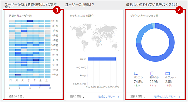 ホームページの訪問者数や直帰率、セッション時間などが表示されています。詳しくは、「ユーザー画面の見方を覚えよう※「はじめてWEB」は