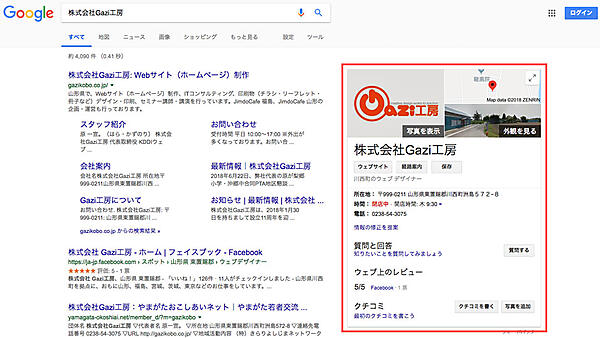 Google マイビジネスに登録していると、検索結果に赤枠部分のように表示される。