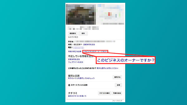 その通り!「ビジネスオーナーですか?」は、テキストリンクになっているのでクリックするんだ。この他に「このビジネスのオーナーですか?」と表示されることもある。内容は同じだ。
