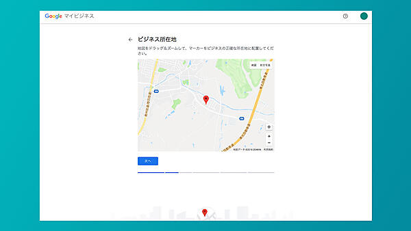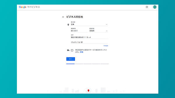 ビジネス名と同様に、所在地がすでに表示されている場合には間違いが無いかを確認・修正する。はじめて登録する場合には入力をし、次に進む。
