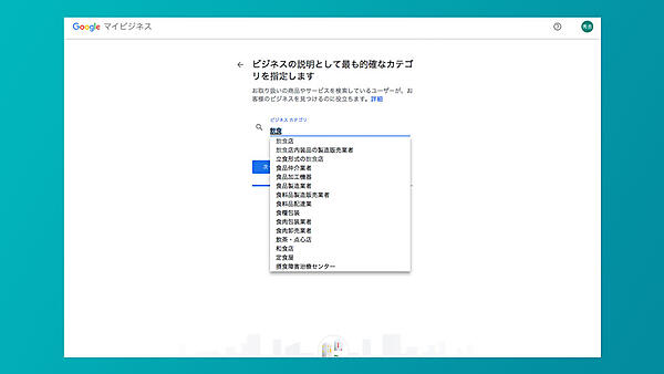 図のように「飲食」と入力すると、飲食店や食品関係のカテゴリ候補が表示される。
