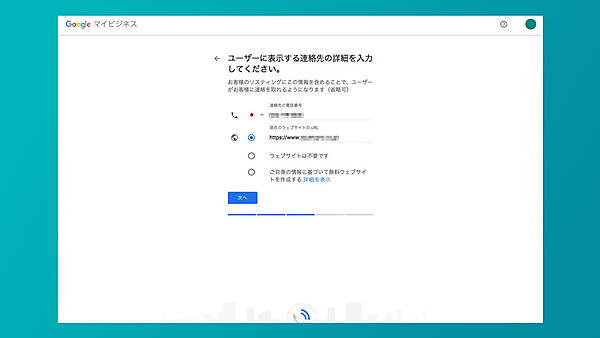 電話番号・ウェブサイトの URL を入力することができる。ここで入力した連絡先は、ビジネス情報を見たユーザーが直接連絡したり、アクセスするものになる。