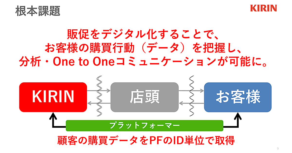 そもそもデジタル販促をするに至った理由の一つとして、キリンの野際氏は、BtoBtoCという業界の構造上、お客様の購買行動(データ)が把握できないことが課題だったと指摘。