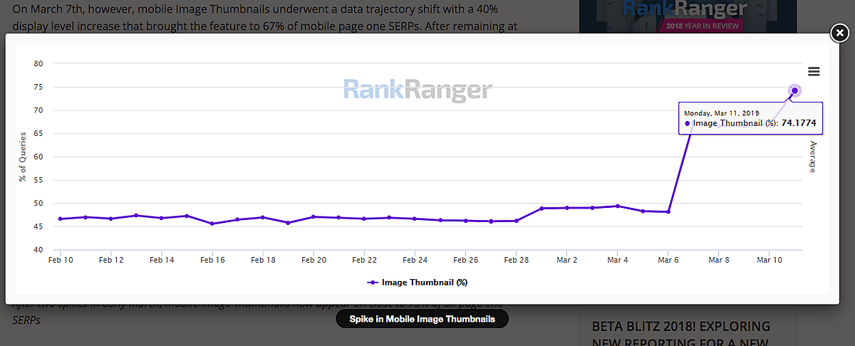 なおRankRangerの計測によると、サムネイルが表示されるモバイル検索結果の割合が3月初めから急上昇したそうだ。