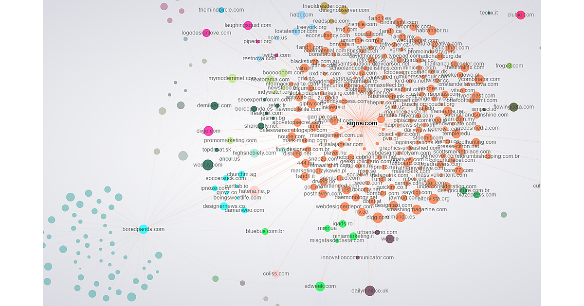 これをさらに深く調べたい人は、ここをクリックするか、上の画像をクリックすると、インタラクティブ版が表示される。これまでの例と同様、ノードの大きさはドメインオーソリティに関連付けられている。