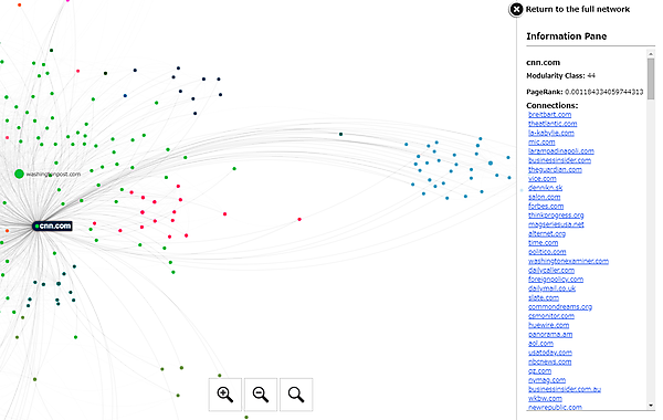 興味深いことに、CNNは地域や地方のニュースへの配信に独自の役割を果たしているようだ。CNNから一番右側の青い塊へ多くのリンクがあることに注目してほしい。