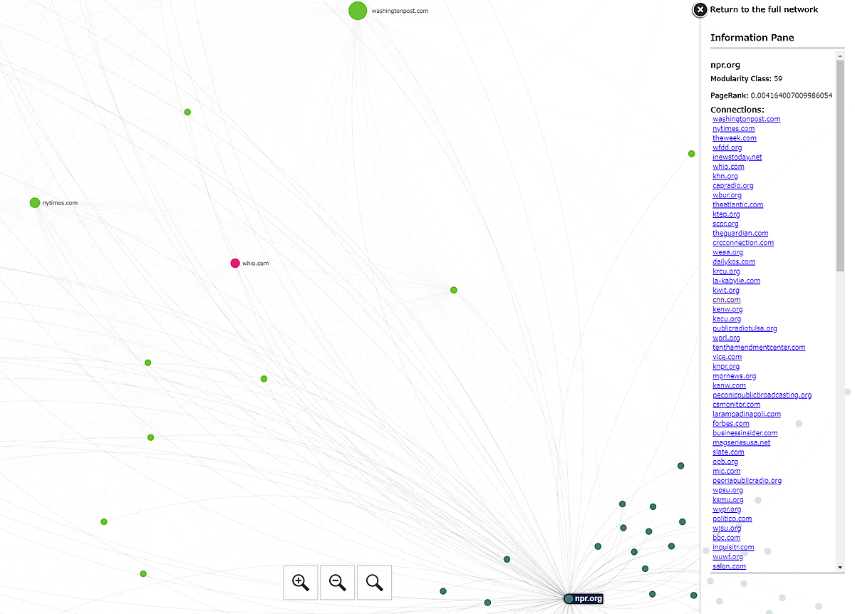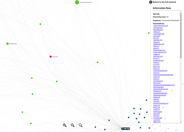 緑色のノードは米国のメディアを表す。これは、前の例と同様、これらの主要なニュースメディアが相互リンクしてお互いの記事を取り上げている頻度の高さを示すとともに、彼らが小規模のパブリッシャーや地域および地方のメディアを参照する頻度がいかに低いかを示している。