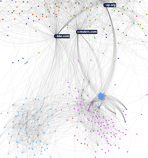 グラフの下部にある青とピンクの塊は、それぞれロシアとウクライナの報道機関だ。それらのリンクの大部分は自己完結型だが、世界的メディアに向けて3つの橋があるように見えることに気付くだろう。具体的には、BBC、ロイター、APとの橋だ。これは、これらのメディアで取り上げられると、少なくとも東ヨーロッパとロシアでは、はるかに広範な国際的シンジケーションにつながる可能性があることを示唆している。