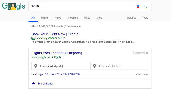 たとえば、格安航空券の比較サイトであるスカイスキャナーは、「flights」(フライト)というクエリに検索連動型広告を入札している。Googleフライトのウィジェットの上に広告を表示させるようにすることで、トラフィックを取り戻す戦略をとったということだ。