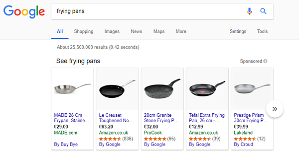 有料広告と同様、SERPにGoogleショッピングのスポンサー広告ばかりが表示されているようなら、Googleショッピング広告を独自に開始する価値があるかどうかを検討する必要がある(つまりグーグルに広告料を支払うということだ)。