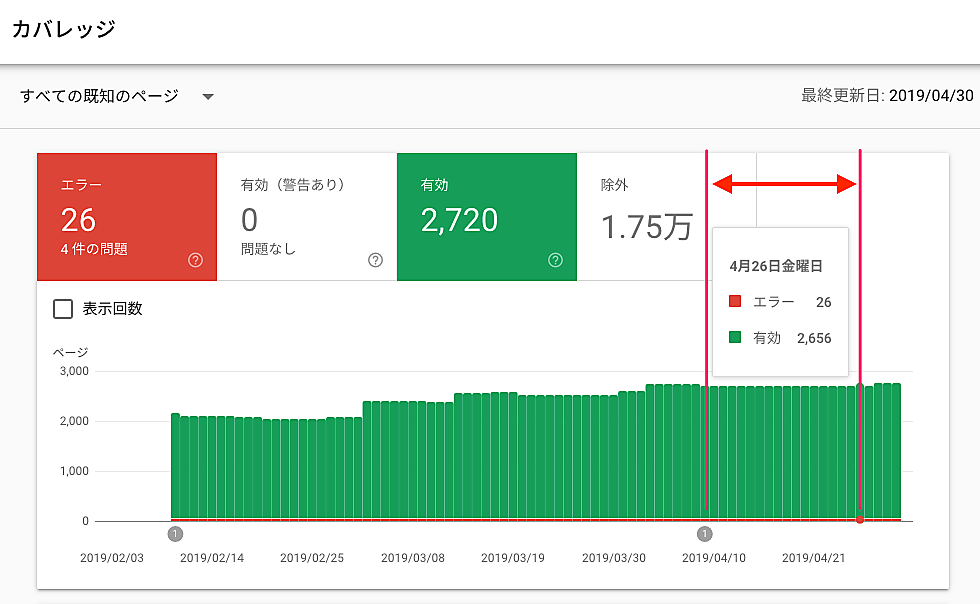 たとえば、4月9日~4月25日のカバレッジレポートの数字は変化がない。この期間は、4月26日のデータになっているためだ。