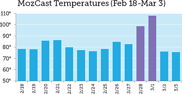 2019年2月28日~3月1日の2日間、グーグル検索順位の変動幅が急に大きくなった。MozCastの記録を見てみると、変動の激しさを表す気温(華氏)は、3月1日に108度に達している。2月28日の気温は最初105度だったが、99度に下方修正された(これについては後述する)。