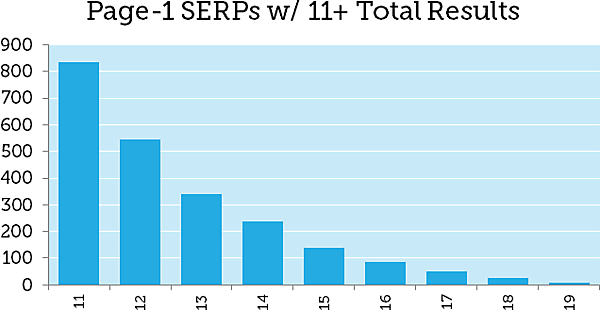 3月1日のデータを詳しく調べたところ、多くの指標に変動が見られたが、特に顕著だったのは、グーグル検索結果ページ(SERP)1ページ目の変動幅が大きく、10件以上のオーガニック検索結果が表示されていたことだ。MozCastのキーワード1万件全体では、上位のキーワードで以下のような状態が観察された。