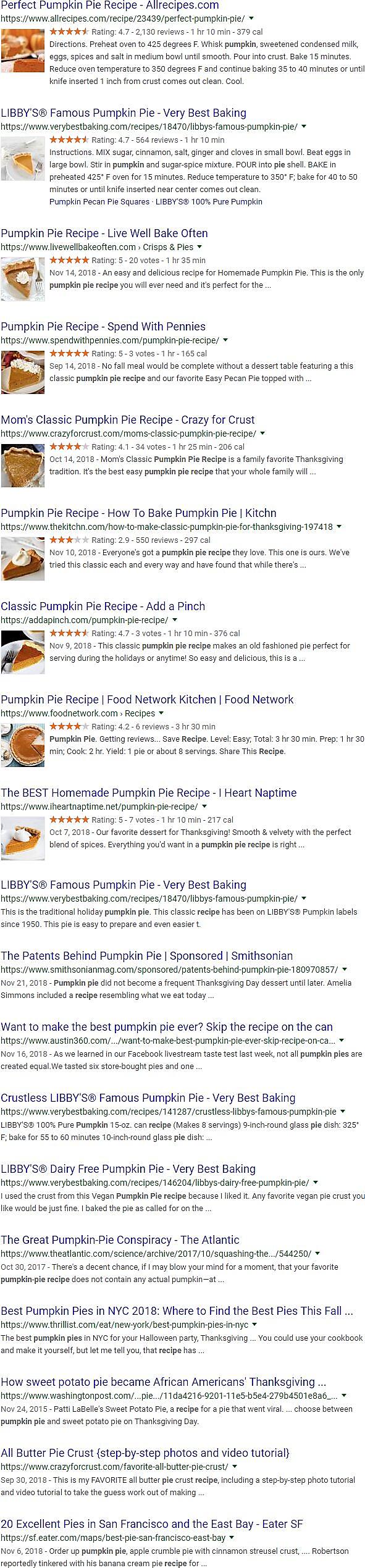 1万件のキーワード全体で、SERPに検索結果が19件表示されたキーワードは9件あった。以下のケースは、(カウントするには)特に単純明快なケースだ。0位の場所に強調スニペットが表示され、続いてオーガニック検索結果と見られる結果が19件表示されている。以下の画像は、米国Google検索で「pumpkin pie recipe」(パンプキンパイ レシピ)を検索した結果そのままのスクリーンショットだ。