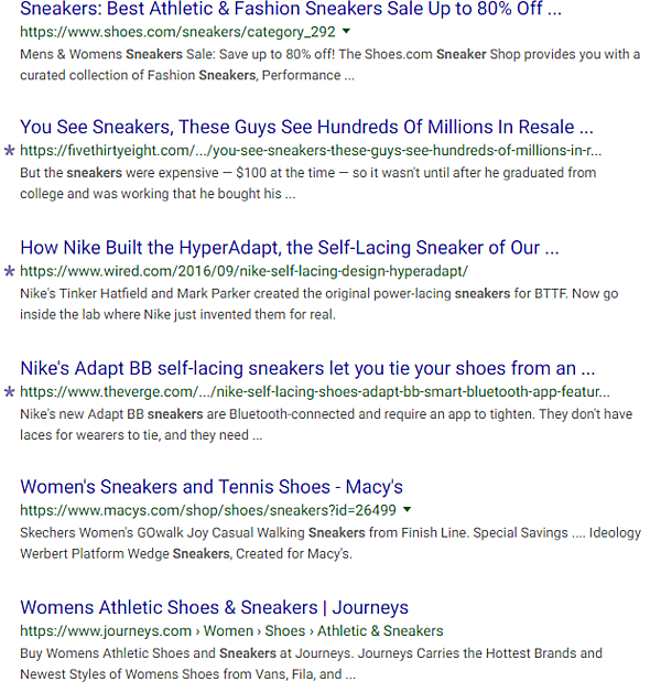 ただし、HTMLソースの深い部分にある目印や、1ページ目の結果件数が合わないことを考えれば、In-depth Articlesが今も存在することはわかっている。たとえば、以下の画像は、3月4日に「sneakers」(スニーカー)を検索したときに1ページ目の最後に表示された結果6件だ。