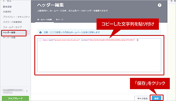 さきほどコピーしたコードを貼り付け「保存」をクリックします。