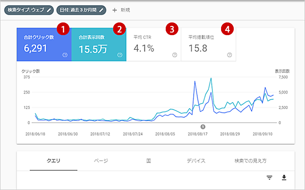 | ①合計クリック数 | 検索結果からクリックしてホームページに来た数です。 |