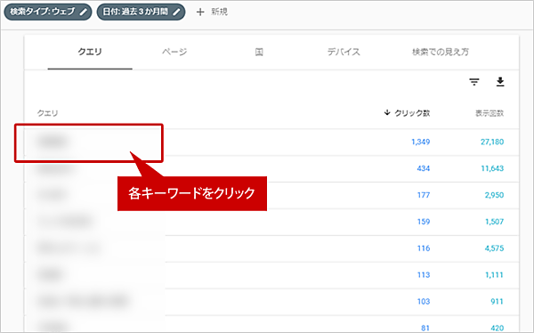 「クエリ」(検索キーワード)の下に並んでいる単語をクリックすると、キーワードごとに詳細分析できます。
