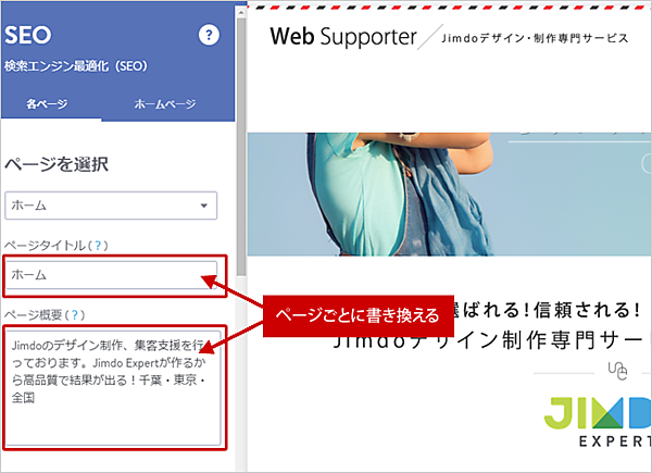 ホームページにログインした後、管理メニューから「パフォーマンス」>「SEO」の画面へアクセスし、「ページタイトル」と「ページ概要」を書き換えます。