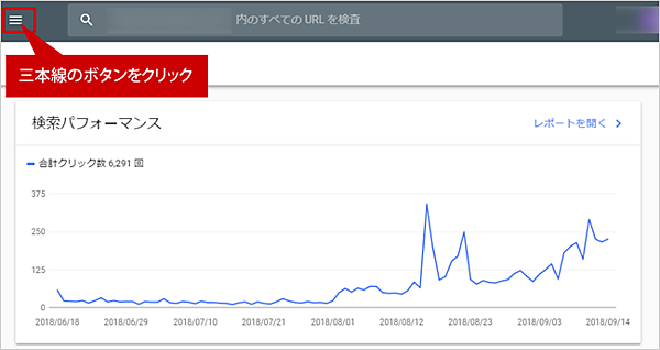 Google サーチコンソールには、キーワードを分析する以外にもさまざまな機能があります。左側にあるはずのメニューが隠れている場合は、以下の手順で表示させましょう。