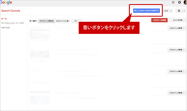 旧画面から新画面へ移行するには、Google サーチコンソールへログインし、画面上部の「新しいSearch Consoleを使用する」をクリックします。