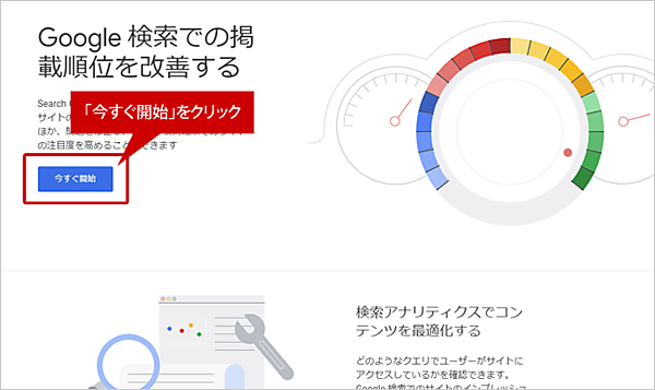 (1) Google サーチコンソールのページへアクセスし、「今すぐ開始」をクリックします。