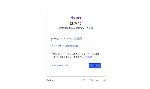 (2) メールアドレス(Gmailのアドレス)とパスワード(Gmailのパスワード)を入力し、「次へ」をクリックしてログインします。