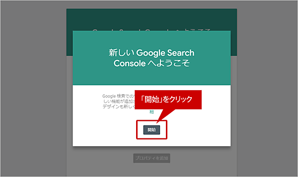 (3)「 新しいサーチコンソールへようこそ」と表示されますので、「開始」をクリックします。