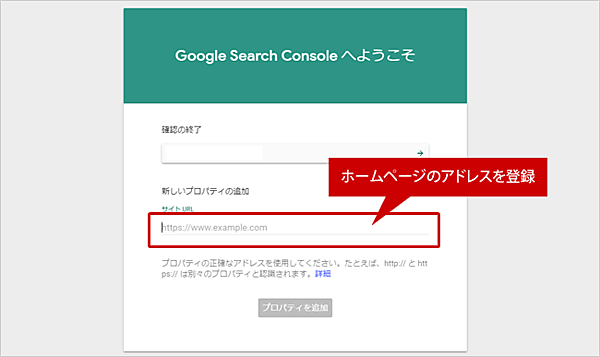 (4) 新しいプロパティの追加の欄に、ホームページのアドレスを入力し、「プロパティを追加」をクリックします。