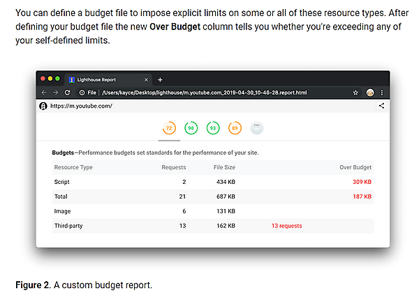 といったものを独自に指定してLighthouseを実行すると、実際のページ表示では基準値をどれぐらい超過しているかをレポートで示してくれるようになる。