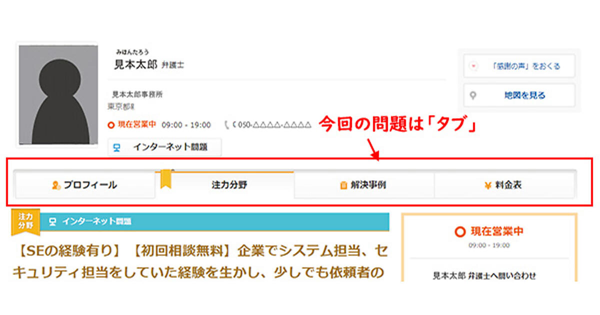 Web上でタブを再現しても、これらの機能は自動的には提供されません。実装者が意図的に実装しなければならないのです。つまり、意識してアクセシビリティを担保しない限り、タブをスクリーンリーダーで読むことは難しいと言えます。弁護士ドットコムのサイトにあったタブも同様で、特別な対応が行われていないものでした。