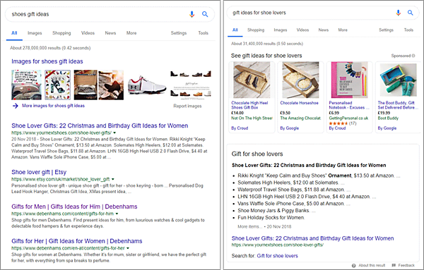 左側は、「shoes gift ideas」というクエリに対するSERPを示している。グーグル画像検索のイメージが横一列に表示され、他の画像を見るためのリンクと、1本の記事ページ(情報コンテンツ)があり、残りの結果はすべて購入可能なトランザクションページやEコマースページだ。グーグルは、僕がコンバージョンに近いと見て、商品ページを探していると想定したようだ。