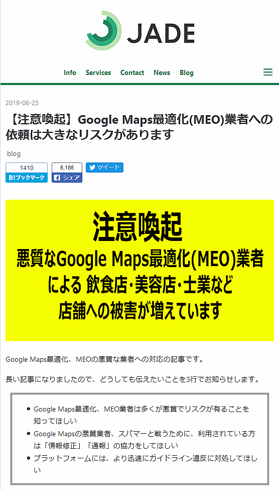 「グーグルマップの最適化」を行うとして「MEO(Map Engine Optimization)」なる用語を掲げてGoogleマップ上でスパム行為を繰り返す悪質な業者を、JADEの辻正浩氏が厳しく糾弾する記事を公開した(JADEは辻氏と元グーグルの長山氏などが2019年6月に立ち上げた新会社)。