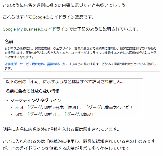 辻氏はこうした違反行為を実行する業者とは絶対に取り引きしないように注意を喚起している。ガイドライン違反を何度も繰り返すと、グーグルマップのリスティングから削除されてしまうこともある(検索でいえばインデックス削除に相当する)。