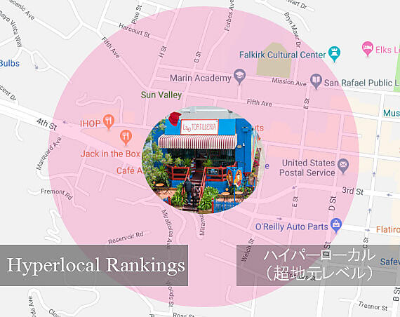 たとえば、サンラファエルにトルティーヤ屋が100店舗ある場合、グーグルは、5番街にスマートフォンを持って立っている検索者のためにローカルパックを構成するのに、あまり遠くの店舗まで含める必要はない。