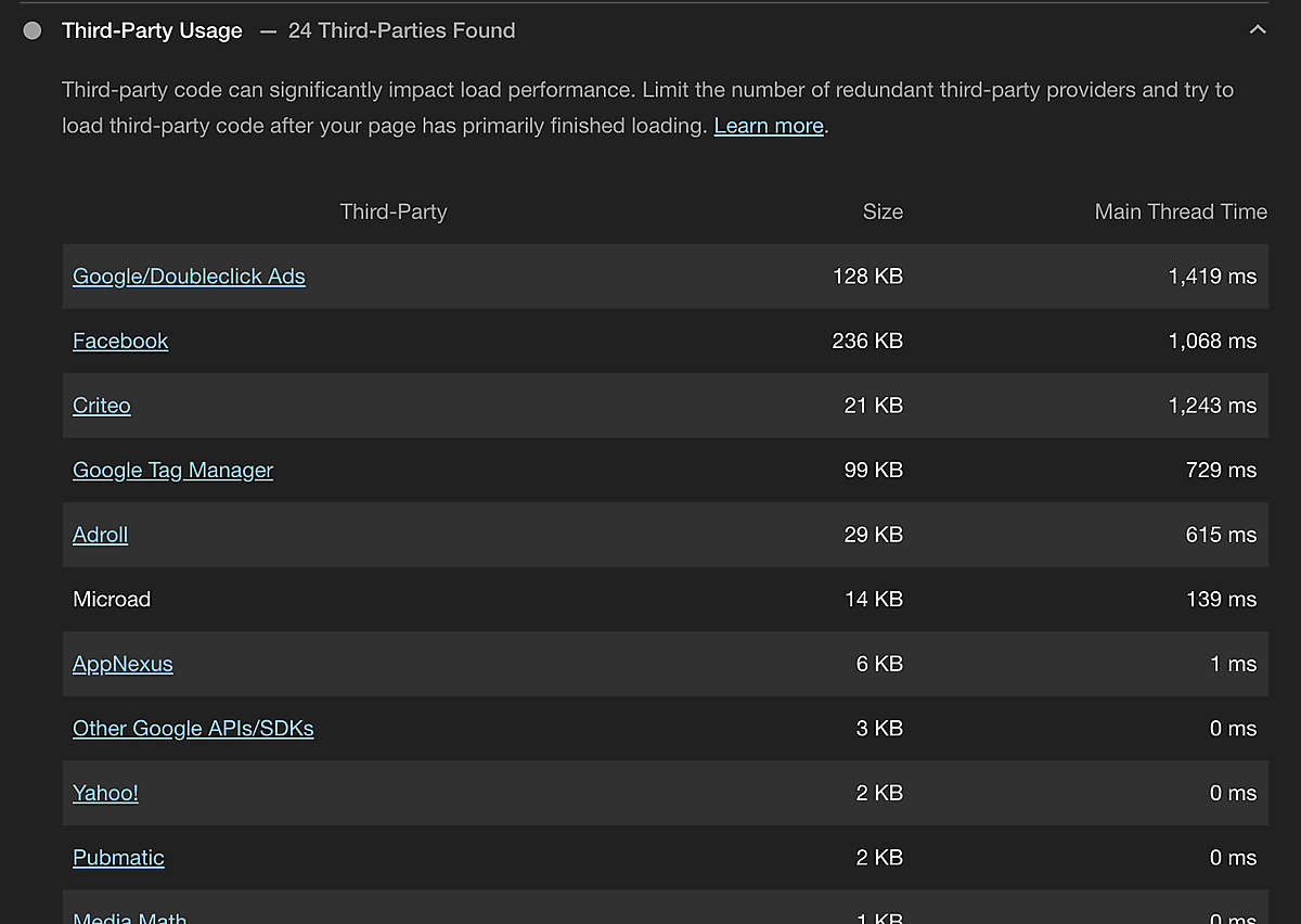 読み込み速度に影響を与えるのは自分のサイトが配信しているリソースだけではない。別のサイトから配信されるリソース(たいていはJavaScript)が読み込み速度を低下させていることもある。