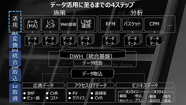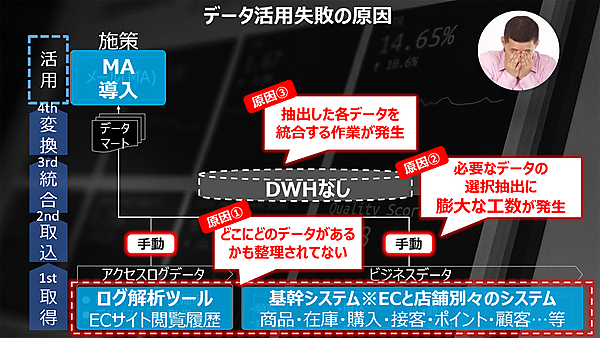 このアパレル企業の場合、店舗とECサイトでは収集しているデータが根本的に異なっており、最初のステップである「取得」の時点でつまずいていた。データを統合するデータウェアハウス(DWH)なしに、毎回手動でMA用にデータを揃えるのは、現実的には難しい。
