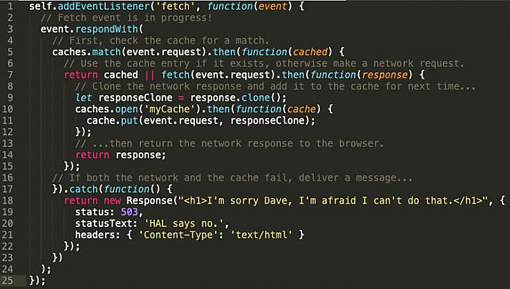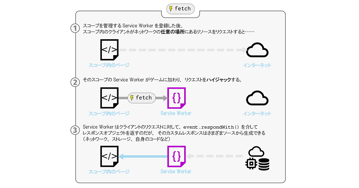 この記事ではなるべくプログラミングコードを記載しないようにしているが、ここだけは少し書かせてもらいたい。僕がまとめた以下の例は、シンプルなService WorkerがFetch APIを使用して、どのようにリクエストを処理したり、許可されるコントロールの範囲を設定したりするのかを示したものだ。