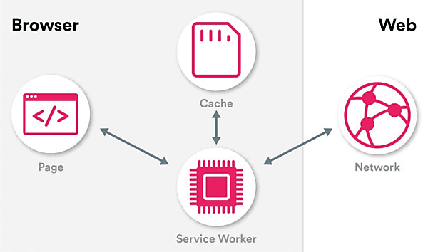 Service Workerは、メインのブラウザスレッドの外側で実行される特殊なJavaScriptファイルだ。ブラウザとネットワークの間に立って、次のような機能を実行する。