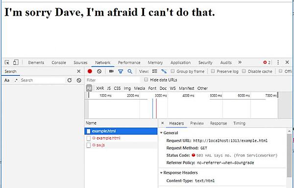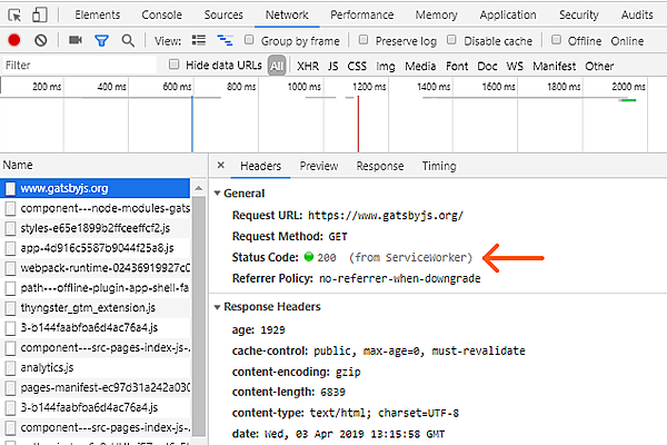 Chromeの開発者ツールを開いて「ネットワーク」タブを見れば、どの応答がService Workerからのものなのかを簡単に確認できる。下図の「from ServiceWorker」という部分を見てほしい。これは、ブラウザがリクエストした内容をService Workerから取得したことを示している。