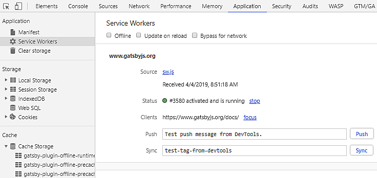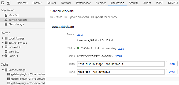「アプリケーション」タブでは、現在のページで実行されているService Workerと、そのService Workerによって作成されたさまざまなキャッシュを確認できる。Service Workerを無効にするか迂回して、Service Workerが使用している可能性のある高度な機能をテストすることもできる。