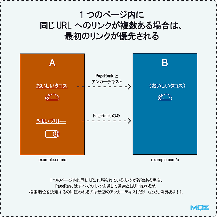 - 1つのページ内に同じURLへのリンクが複数ある場合は、最初のリンクが優先される