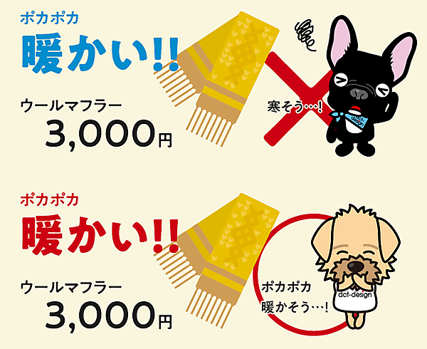 商品紹介の際に「冬」を連想して水色などを使ってしまいそうですが、商品の効果をアピールするためには「暖かい」を連想させると効果的です。