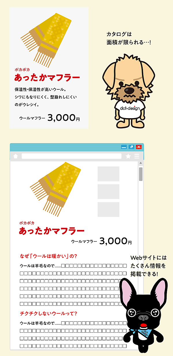 例えば、商品カタログなどの場合、ページ数が限られるものはひとつの商品に使えるスペースが限られます。そのため、掲載する情報量も限られてしまいます。