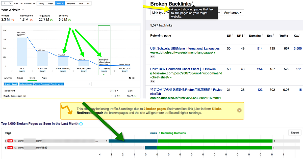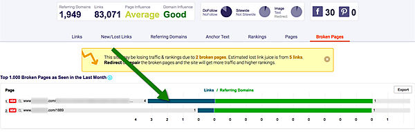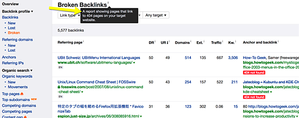 Ahrefsにはリンクビルディングに極めて有用な機能がある。指定したドメイン名のアクセスできないページにリンクしているすべてのページを見つけ、エクスポートできるのだ。